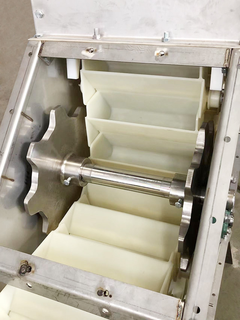 (1)驅動功率小,采用流入式喂料、誘導式卸料、大容量的料斗密集型布置,在物料提升時幾乎無回料和挖料現象,因此無效功率少。